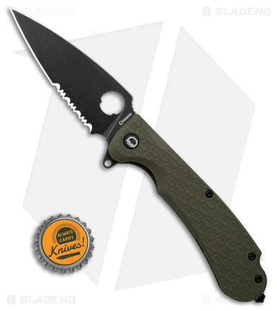 - Partially serrated, black spear point blade made of 8Cr14MoV steel.