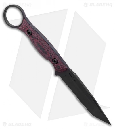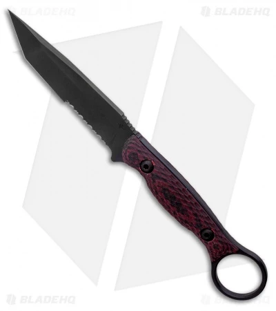 - Black and red G-10, textured handle with full tang construction featuring a finger hole.